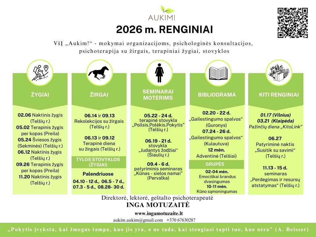 - Konsultuoju invidividualiai, vedu grupes, mokymus, terapinius žygius, stovyklas.